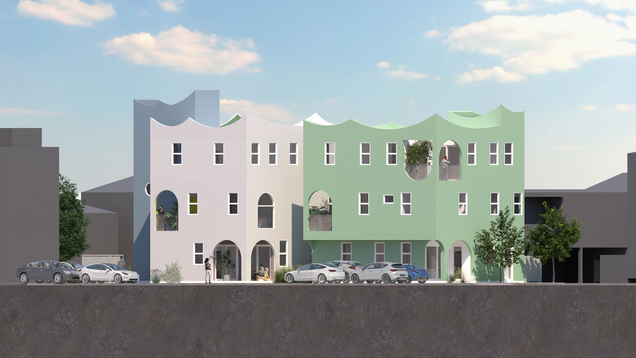 This project is the result of navigating just under the threshold of multi-dwelling building standards in order to create affordable dwellings quickly. These are two detached duplexes with ADUs. Three dwelling units in each three story building. Such buildings are still under the "R3" occupancy category which is the same as single family dwellings and can be serviced with a single stair core. Entitlements are "by-right" so no discretionary review. From property acquisition through design, permitting and construction, the approximate project schedule will be less than 18 months. In the City of LA to get six dwellings in about 1.5 years is almost light speed.